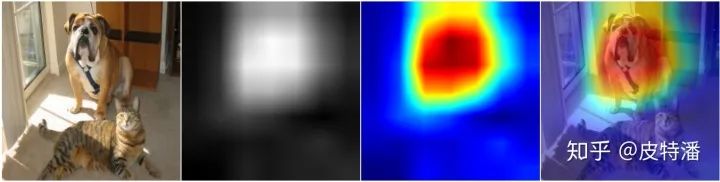 可视化的时候,可以利用热力图和原图叠加的形式呈现。如下图,颜色越深红的地方表示值越大。可以认为,网络预测“狗”这个类别时,红色高亮区域是其主要判断依据。