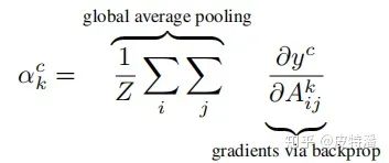 仅需要对目标类别的score进行求导, 然后追踪到目标特征图的梯度, 对该梯队进行element-wise求平均(GAP操作)即获得特征融合的权重。具体如下: