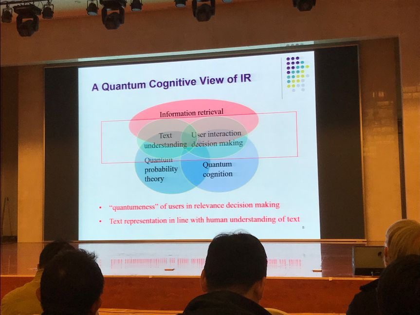 来自北理工的宋大为教授的报告则更为新颖的角度,其主题为《A quantum cognitive perspective for informationaccess and retrieval》,即量子认知,借用量子力学的方法和语言来进行认知、信息获取等的研究。值得一提的是,宋大为以及天津大学的张鹏也是目前国内少数几位将量子力学与NLP结合起来研究的学者。