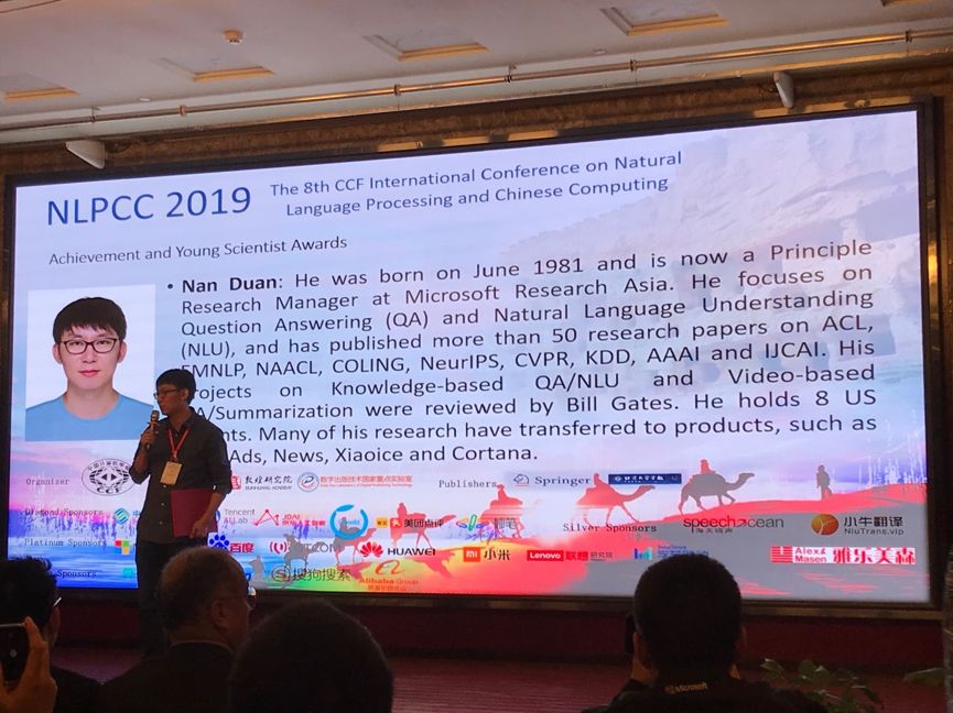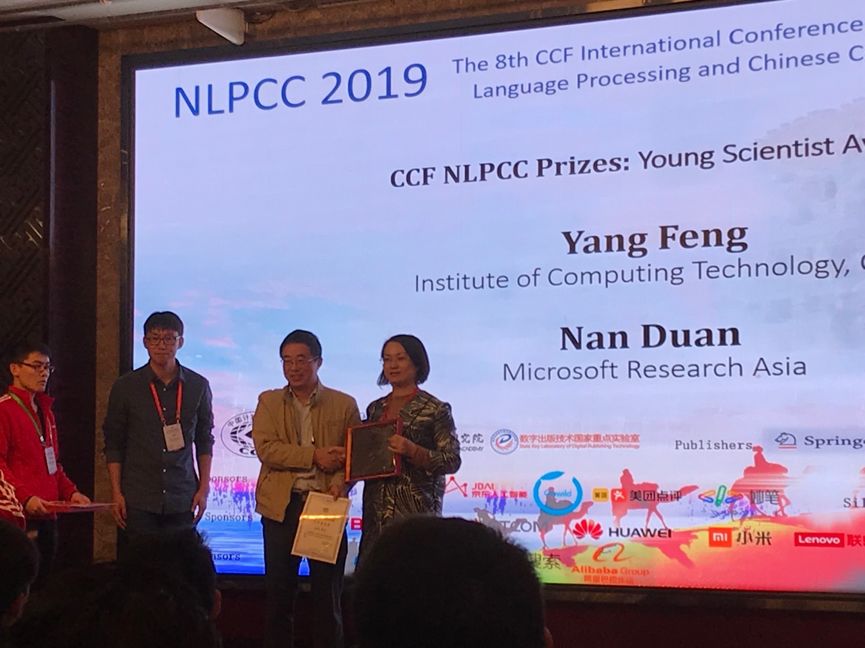 青年科学家奖每届两人。本届NLPCC 青年科学奖获得者分别为中科院计算所冯洋研究员和微软亚洲研究院段楠研究员。