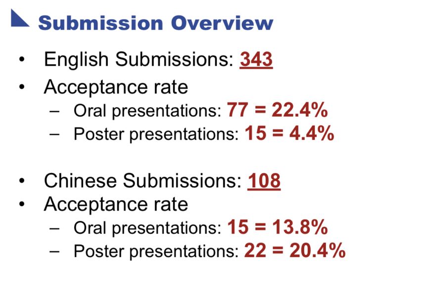 在451篇主会投稿中,接收长文(Full paper) 92篇,录用率为20.40%;