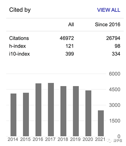 截止到今天,高会军的论文总引次数已经超过了4万,而H因子更是到达到了121: