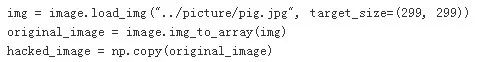 然后加载我们攻击的图片,比如我们的小猪。这里需要特别强调的是,NumPy出于性能考虑,默认的变量赋值会引用同样一份内存,所以我们需要使用np.copy手工强制复制一份图像数据。
