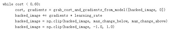 下面我们要定义最关键的三个函数了,我们定义损失函数为识别为烤面包机的概率,因此我们需要使用梯度上升算法,不断追求损失函数的最大化,变量object_type_to_fake定义的就是烤面包机对应的标签,在InceptionV3中面包机的标签为859。