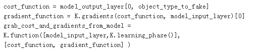 有了损失函数以后,我们就可以通过Keras的接口获取到对应的梯度函数。最后通过K.function获取一个Keras函数实例,该函数的输入列表分别为输入层和当前是训练模式还是测试模式的标记learning_phase(),输出列表是损失函数和梯度。关于K.function的使用建议阅读Keras的在线文档。