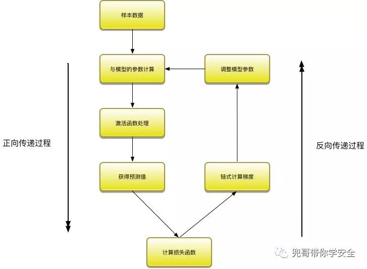 在进行神经网络训练时,追求的是损失函数最小,因此每轮训练时,通过训练集数据与模型的参数进行矩阵计算,获得预测值,这一过程成为正向传递。然后通过计算预测值与目标值的损失函数,通过链式法则,计算出梯度值,然后根据梯度下降算法调整模型的参数值,这一过程成为反向传递。经过若干轮训练后,损失函数下降到可以接受的程度,模型的参数也完成了调整,整个训练过程结束。