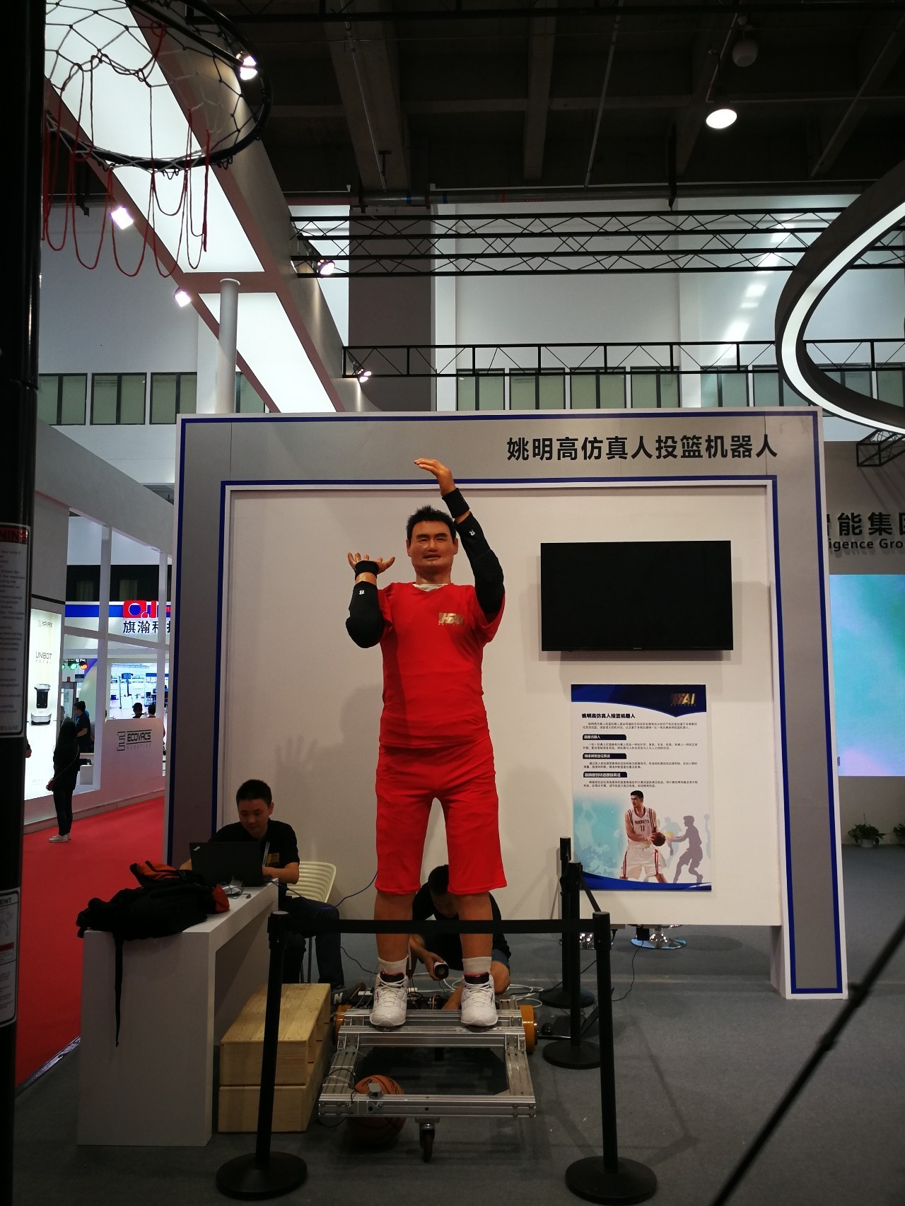 你看!右手托球、左臂斜上方45度扬起,双眼紧盯篮筐,瞄准、出手!“进了,进了,好棒啊!”现场喝彩不断,掌声不停。这个身着一套红色运动衣的“大块头”——姚明高仿真投篮机器人,在2017年世界机器人大会上首次参展便大放异彩,引来众多观众驻足观看、拍照。