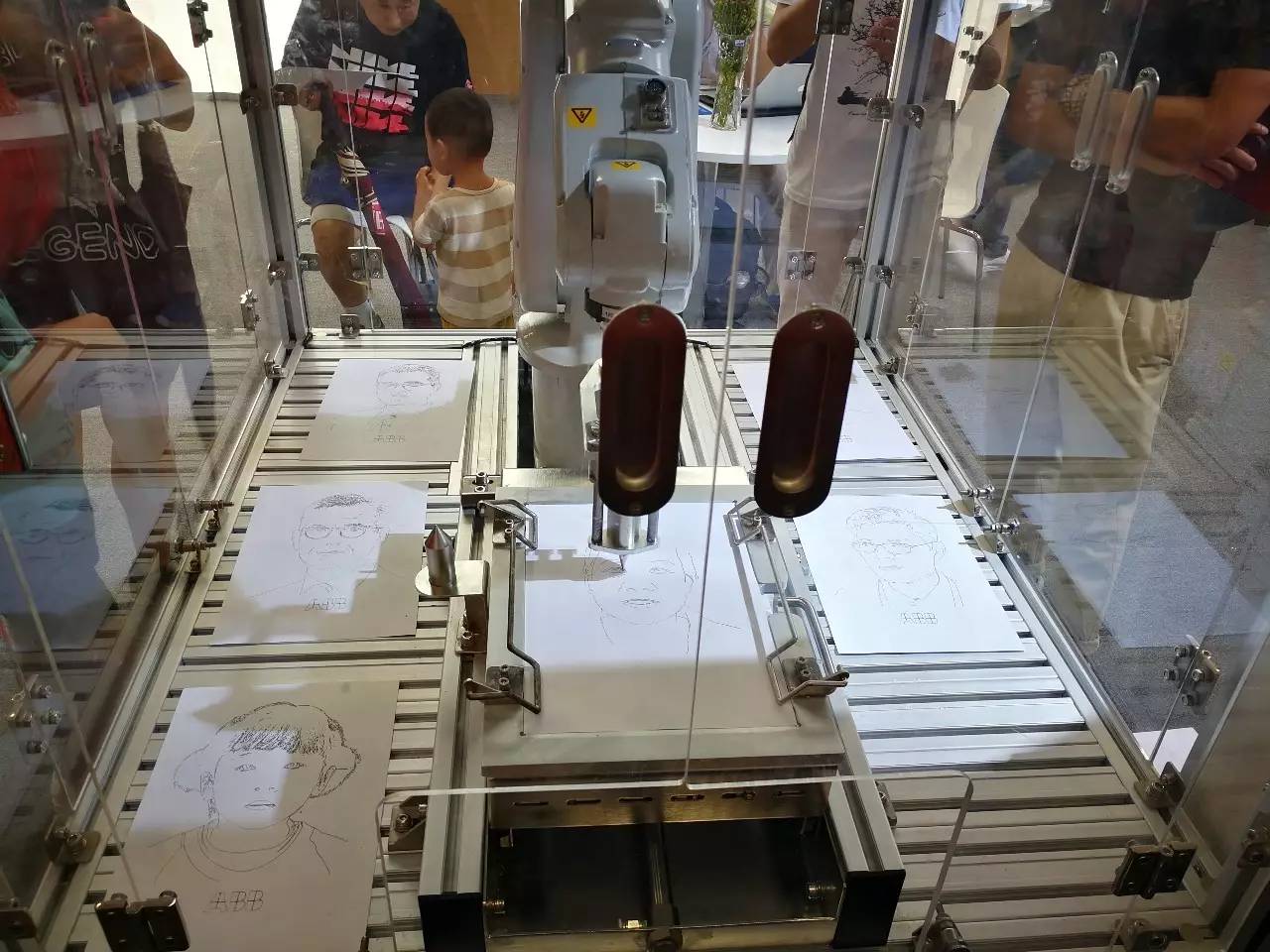 “画得很像,构图又快又好。”张女士拿着自己的肖像图,非常高兴。工业机器人展览馆内,原本用于物料搬运、包装涂胶的IRB120机械臂机器人摇身一变成为素描大师。ABB工程有限公司客户经理赵伟告诉记者:“机器人使用摄像头对人脸进行拍照,并自动生成运动轨迹。IRC5运动控制器对已生成的路径进行优化后,在A4纸上完成绘图。”