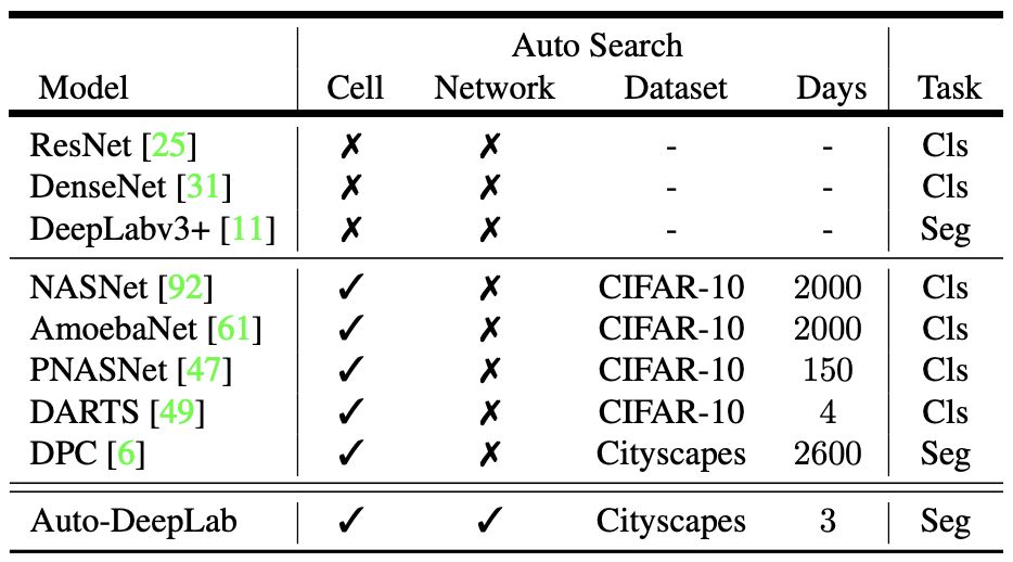 表 1:本研究提出的模型 Auto-DeepLab 和其它双层 CNN 架构的对比。主要区别有:(1) Auto-DeepLab 直接搜索用于语义分割的 CNN 架构;(2) Auto-DeepLab 搜索网络级架构和单元级架构;(3) Auto-DeepLab 的高效搜索在一个 P100 GPU 上仅需 3 天。