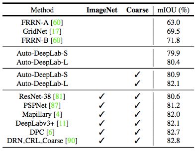 表 2:不同 Auto-DeepLab 模型变体在 Cityscapes 验证集上的结果。F:控制模型容量的 filter multiplier。所有 Auto-DeepLab 模型都是从头开始训练,且在推断过程中使用单尺度输入。