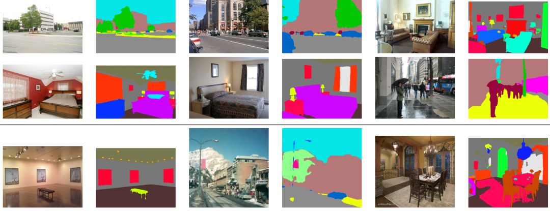图 6:在 ADE20K 验证集上的可视化结果。最后一行展示了本研究提出方法的故障模式,模型无法分割非常细粒度的对象(如椅子腿),且将较难的语义类别混淆了(如地板和地毯)。