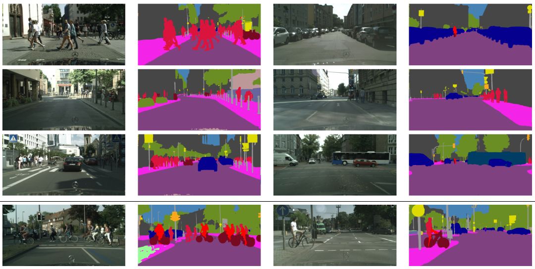 图 5:在 Cityscapes 验证集上的可视化结果。最后一行展示了本研究提出方法的故障模式,模型将一些较难的语义类别混淆了,如人和骑车的人。
