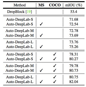 表 5:PASCAL VOC 2012 验证集结果。本研究采用多尺度推理(MS,multi-scale inference)和 COCO 预训练检查点(COCO)进行实验。在未经任何预训练的情况下,本研究提出的最佳模型(Auto-DeepLab-L)超越了 DropBlock 20.36%。所有的模型都没有使用 ImageNet 图像做预训练。