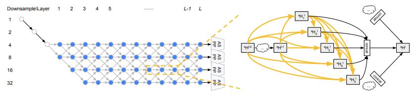 图 1:左图是 L = 12 时的网络级搜索空间。灰色节点表示固定的「stem」层,沿着蓝色节点形成的路径表示候选网络级架构。右图展示了搜索过程中,每个单元是一个密集连接的结构。
