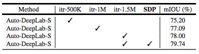 表 3:Cityscapes 验证集结果。研究采用不同的训练迭代次数(50 万、100 万与 150 万次迭代)和 SDP(Scheduled Drop Path)方法进行实验。所有模型都是从头训练的。