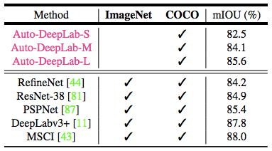 表 6:PASCAL VOC 2012 测试集结果。本研究提出的 AutoDeepLab-L 取得了可与众多在 ImageNet 和 COCO 数据集上预训练的顶级模型相媲美的结果。
