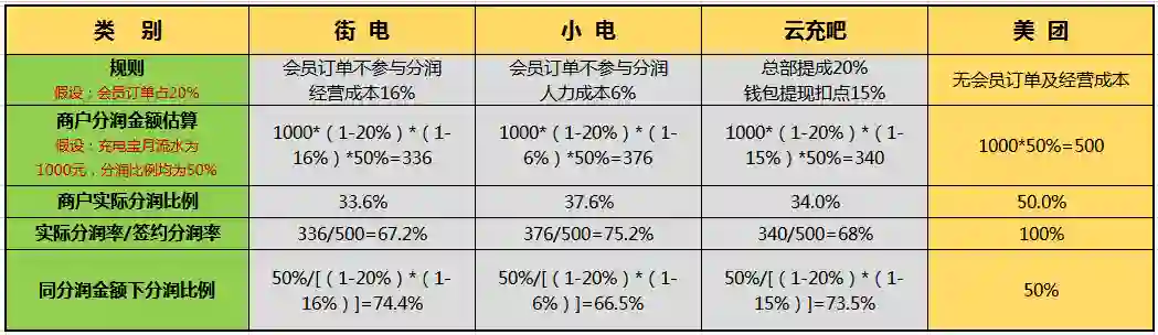 这让商家拿到手的实际分润比例低于50%,平均为35%;对比之下美团没有会员订单及其他成本,充电宝流水的50%就是实际收益。