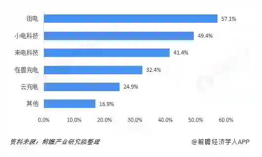 此后,市场逐步稳定为“4+1”格局,即第一梯队的怪兽、街电、小电、来电,以及第二梯队的云充吧。其中街电在商家端的品牌知名度最高,前瞻产业研究院数据显示,街电认知度达57.1%,小电、来电、怪兽居其后。