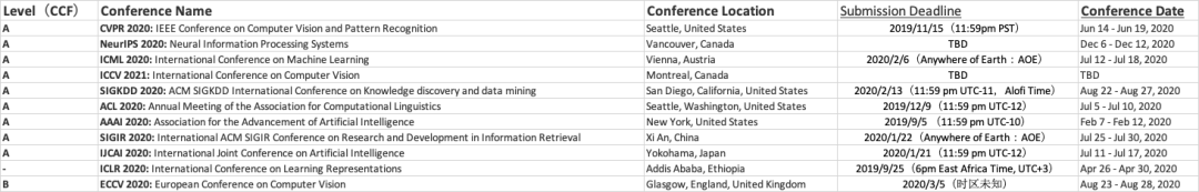 会议举办地、举办时间和征稿情况请参考下表(部分顶会未更新最新情况):