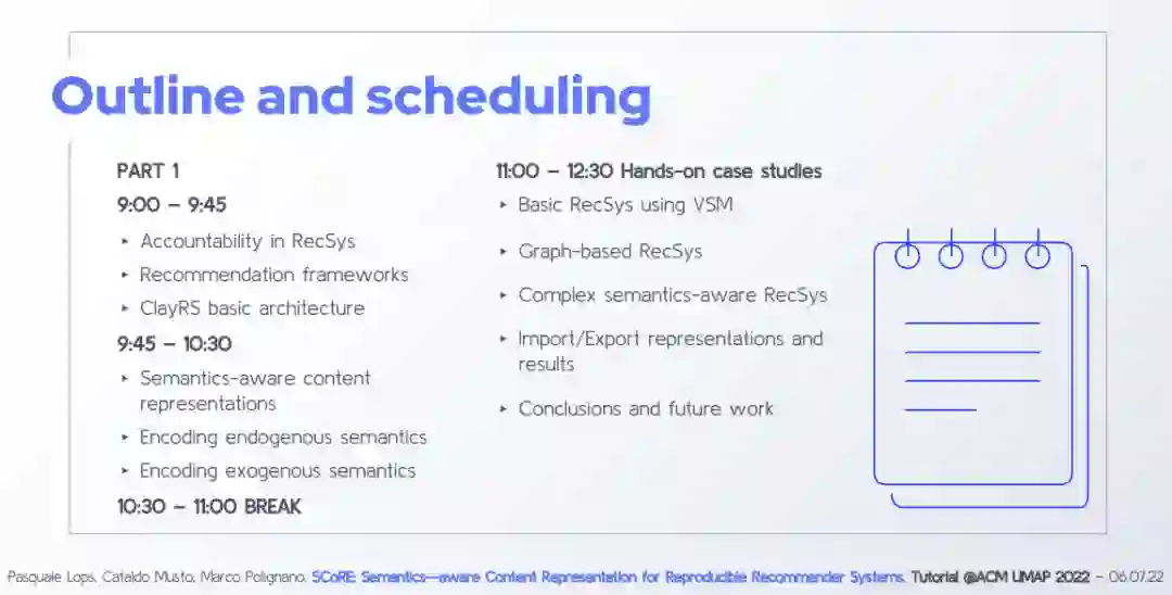 基于内容的推荐系统通过基于描述性特征(通常通过处理文本内容获得)构建用户和条目的表示,向用户推荐与用户过去喜欢的条目相似的条目。处理文本内容的一种经典方法是使用基于关键字的表示,其中提取的术语很少代表整个内容。经典的基于关键字的表示有一个明显的局限性,即它们通常不足以正确地捕捉用户的偏好以及条目所传达的信息内容。当然,对信息内容的次优理解会导致用户和条目的次优表示,进而导致不准确的推荐。因此,为了充分利用基于内容的特征和文本数据的潜力,有必要改进这种表示。语义感知的推荐系统代表了最具创新性的研究方向之一,其目标是使用语义方法来表示内容。有了这些表象,才有可能赋予自然语言所表达的信息以意义,并获得更深层次的理解。本教程旨在从理论和实践两个角度介绍用于内容表示的语义感知技术,以实现有效和负责任的推荐系统。我们将介绍由SWAP研究组开发的全面的Python框架ClayRS,它将在未来几个月公开发布,旨在为研究人员和对用户建模和推荐系统的最新语义感知技术感兴趣的实践者提供一个共同的基础。