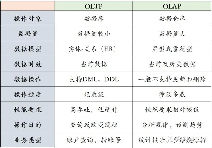 单次OLTP处理的数据量比较小,所涉及的表非常有限,一般仅一两张表。而OLAP是为了从大量的数据中找出某种规律性的东西,经常用到count()、sum()和avg()等聚合方法,用于了解现状并为将来的计划/决策提供数据支撑,所以对多张表的数据进行连接汇总非常普遍。