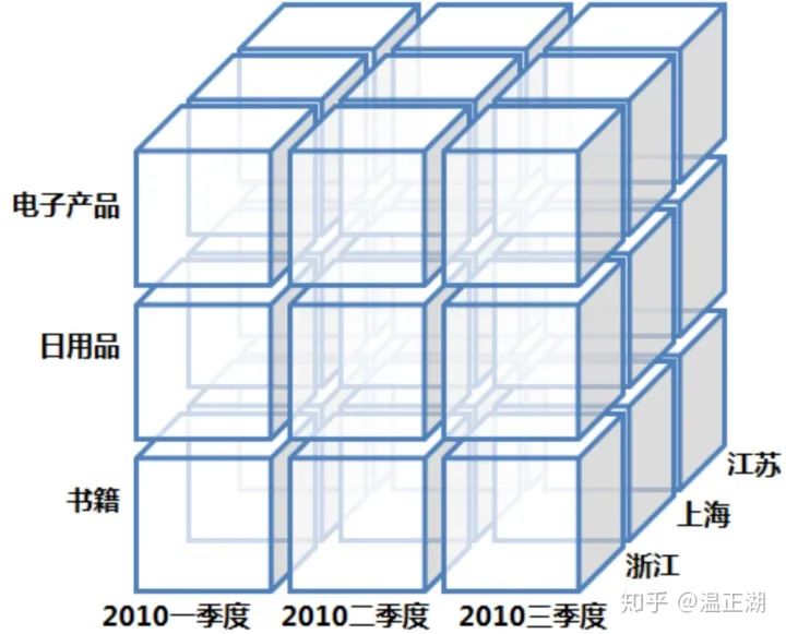 上图来源于参考资料,比较好展示了多维模型,从大立方体上可以看到商品类型、季度和地区三个维度。但对于每个维度又是一个小立方体,比如第一季度浙江的书籍销售情况就是左下角的小立方体。在这个小立方体中,根据需要,我们还可以按照书籍类型,从季度拆分为月度,浙江拆出各地级市。