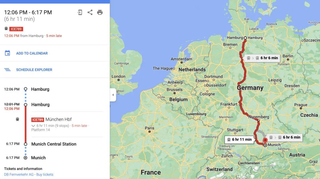 我们再来看看德国铁路公司。如前所述,他们的旅客信息平台是实时的。最近,德国铁路公司宣布与谷歌合作,与谷歌地图进行第三方集成。谷歌地图用户可以获得实时列车时刻表的更新信息: