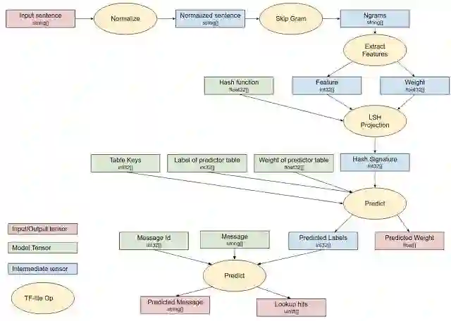 有趣的是,上面描述的ML架构允许灵活选择底层模型。我们还设计了与不同机器学习方法兼容的架构——例如,当使用TensorFlow深度学习时,我们学习了一个用于底层模型的轻量级的神经网络(ProjectionNet),而不同的架构(ProjectionGraph)则使用图形框架代替神经网络来表示模型。