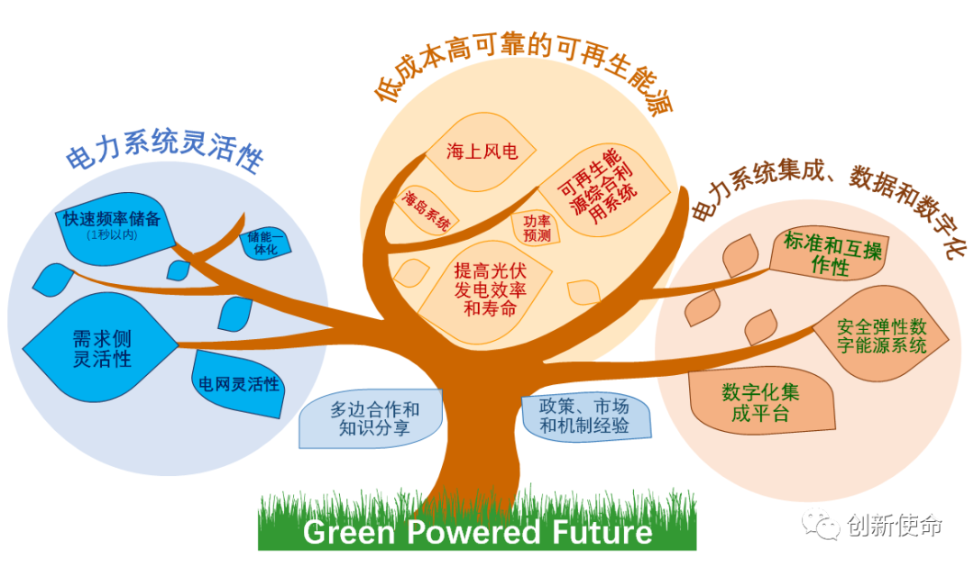 当前的绿色电力技术仍旧可以被看成是一颗有待成长的小树苗,为有效应对绿色电力技术创新所面临的三个重大挑战,“绿色电力未来”使命从低成本高可靠的可再生能源、电力系统灵活性、电力系统集成数据和数字化三个方面开展国际合作工作,标识出海上风电、高效新型光伏等十七个创新主题和100多项创新性技术。其中就包括,刚才所提到的海上风电、海上漂浮式光伏、海上全直流发电等技术。