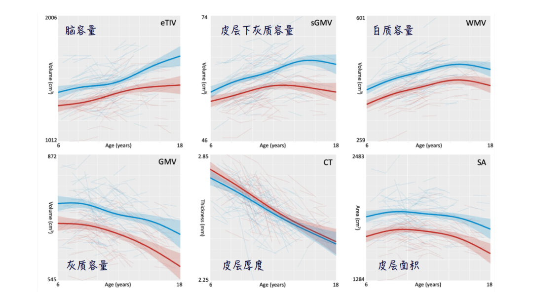 图 4 不同脑结构指标在学习鼎盛时期(6-18岁)的变化规律(女性红色,男性蓝色)
