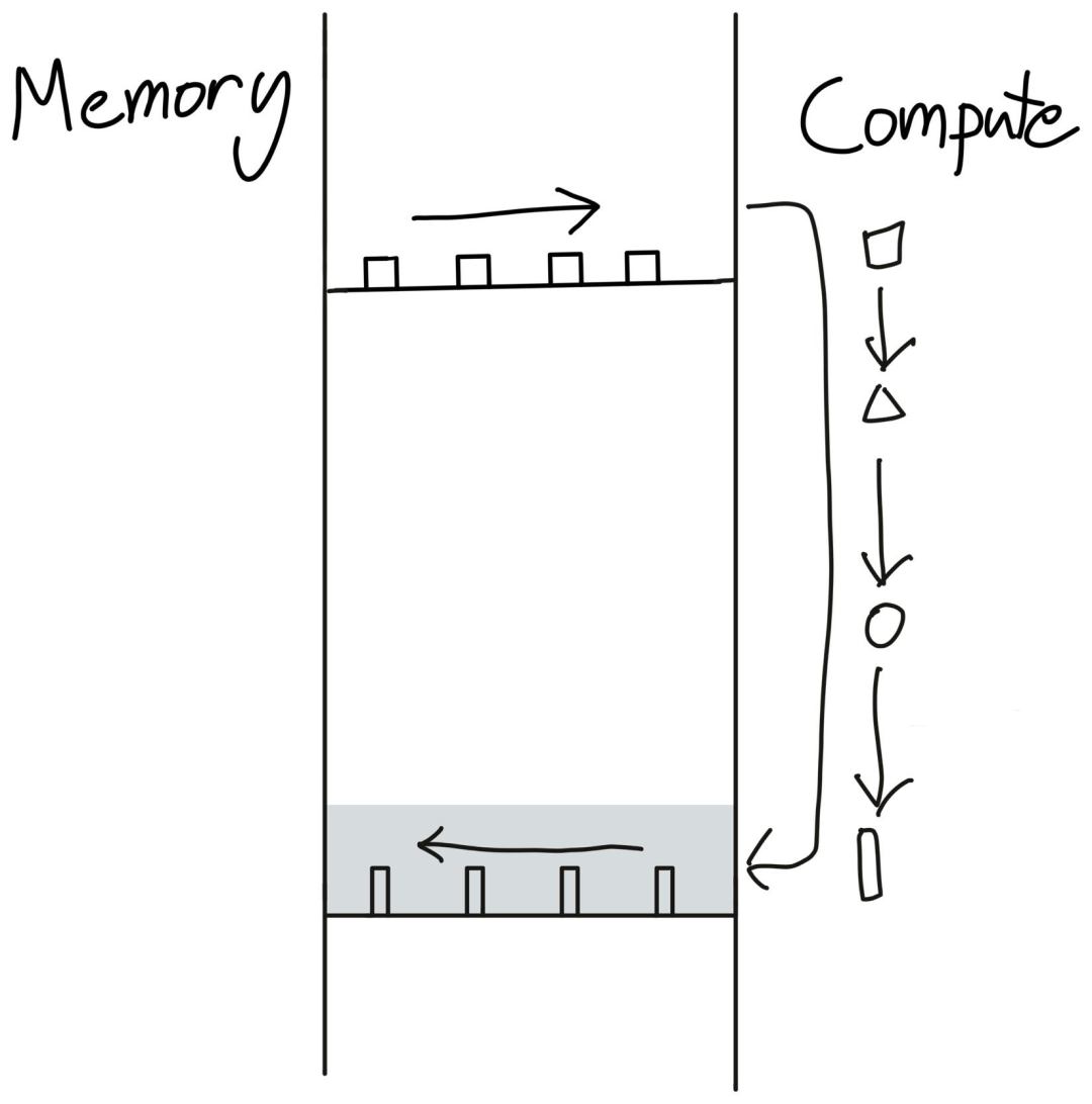 对于简单的算子来说,可以直接推理内存带宽。例如,A100有1.5T字节/秒的全局内存带宽,可以进行19.5T FLOPS的计算。因此,如果你使用32位浮点(即4个字节),GPU可以执行20万亿次操作的相同时间内加载4000亿个数字。此外,为了执行一个简单的单项运算(如把一个tensor乘2),实际上需要将tensor写回全局内存。所以将单项运算做了大约一百次以后,才能够等到内存数据送进来。