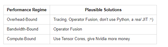 如果模型把大部分的时间都花在了内存传输上,那么增加GPU的FLOPS是没有用的。又或者如果你把所有的时间都花在执行大块的数学运算上,那么把你的模型逻辑改写成C++来减少开销也没有用。
