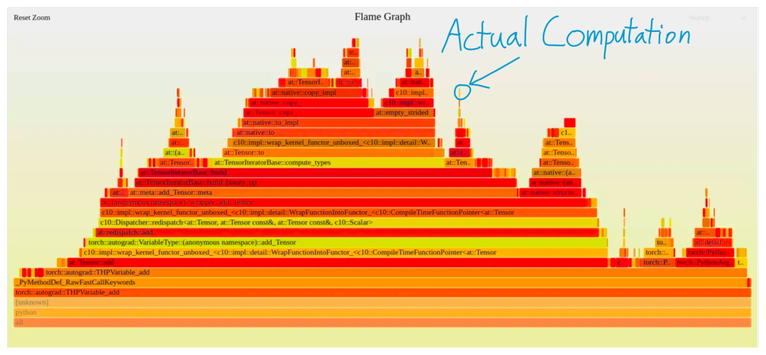 一个更直观的图可以看到,PyTorch执行一个加法时产生的配置文件,除了一个小方块外,其余所有的都是纯开销。