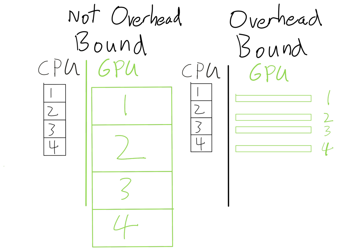 代码中没有花在传输或计算tensor的时间都称为开销(overhead),比如花在Python解释器上的时间,花在PyTorch框架上的时间,花在启动CUDA内核(但不执行)的时间都是开销。