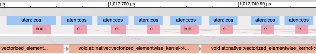 现在我们就知道执行torch.cos这样的单个操作时,几乎每做一次这样的简单运算,数据都需要从内存运到GPU里,运送成本比计算成本要高很多,所以时间几乎都花在内存上了,这种情况也称为memory-bound operation。