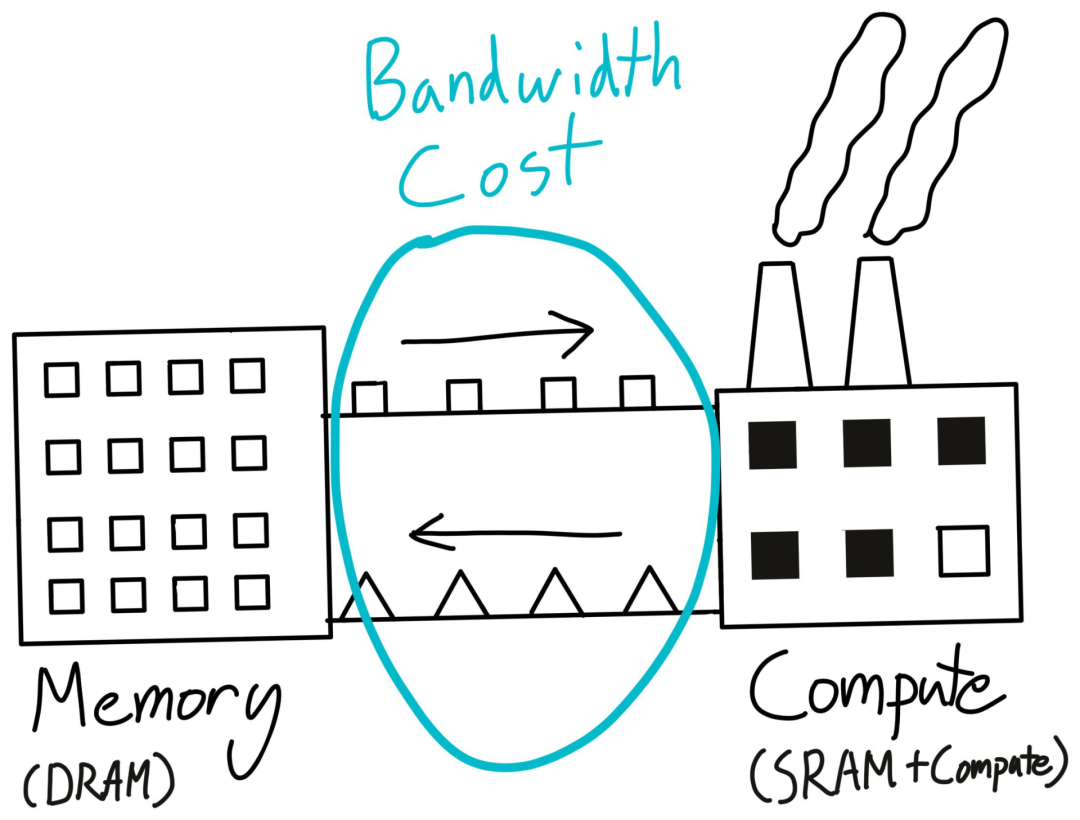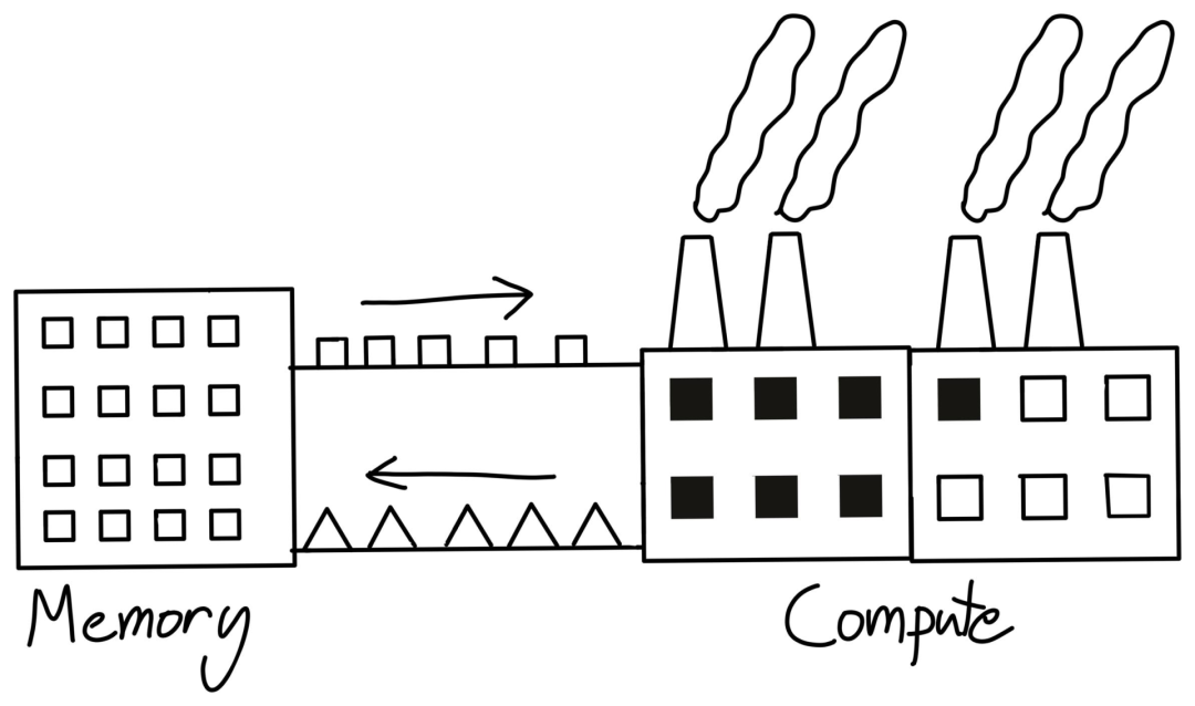回到工厂那个例子,虽然工厂可以完成一些计算任务,但它并不是一个适合存储大量数据的地方。典型的做法是利用更便宜的硬件来建立一个数据仓库(DRAM),然后在仓库和工厂之间运送物资,也就是内存带宽。