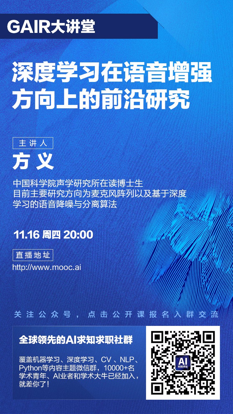 现实生活中干扰噪声的存在严重影响到助听器、人工耳蜗等听力设备佩戴者的语音可懂度。同时在智能语音交互设备中,这些干扰噪声的存在也严重影响了语音识别的正确率,随着智能音箱等设备的大热,语音前端信号处理越来越被重视起来。本次分享主要对单(多)通道的传统语音增强算法做个简单的汇总,然后重点讲解一下目前学术上比较前沿的基于深度学习的语音增强与分离算法。