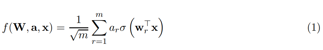 其中 x ∈ R^d 为 d 维实数向量输入,w_r ∈ R^d 为第一层的权重向量,a_r ∈ R 为输出权重。此外,σ (·) 表示 ReLU 激活函数:σ (z) = z if z ≥ 0、 σ (z) = 0 if z < 0。