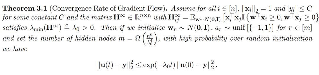 在这一篇论文中,作者们严格证明了只要 m 足够大,且数据是非退化的,那么使用适当随机初始化的 a 和 W(0),梯度下降能收敛到全局最优解,且收敛速度对于二次损失函数是线性的。线性速率也就是说模型能在 K = O(log (1/ε)) 次迭代内搜索到最优解 W(k),它能令 L(W(K)) ≤ ε。因此,作者理论结果并不仅仅展示了全局收敛性,同时还为达到期望的准确率提供了量化的收敛率。