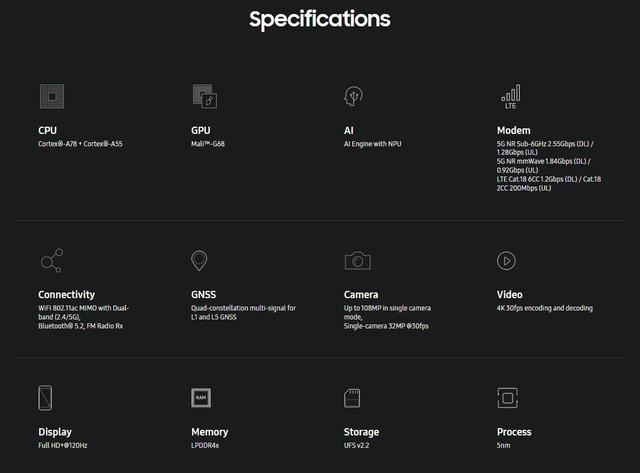官方信息显示,Exynos 1280 芯片定位中端。使用三星的 5nm EUV 工艺制造,CPU 为 8 核(由两个 Cortex-A78 性能核心和六个 Cortex-A55 节能核心组成),GPU 方面由 Arm Mali-G68 负责,支持 Sub-6GHz 和 mmWave 5G 网络。新芯片采用了融合乘加(FMA)优化,将带来更好的功耗和电池寿命。