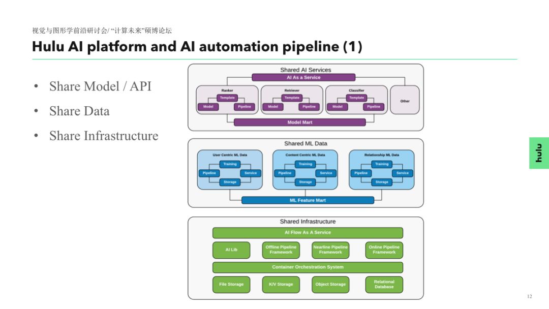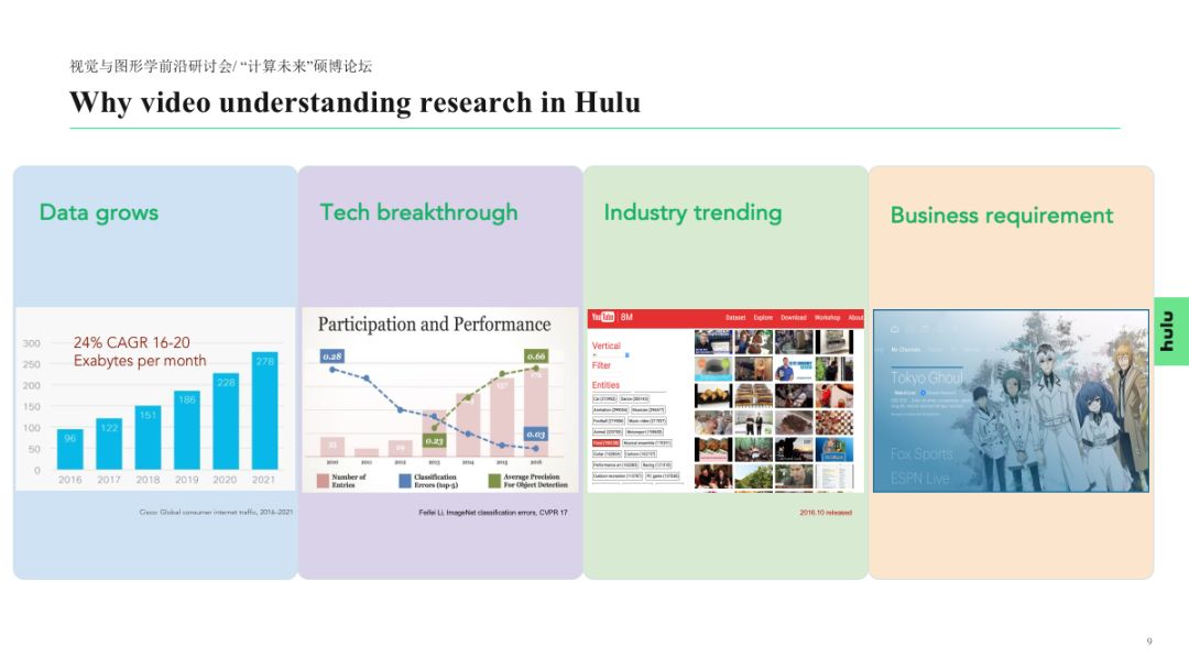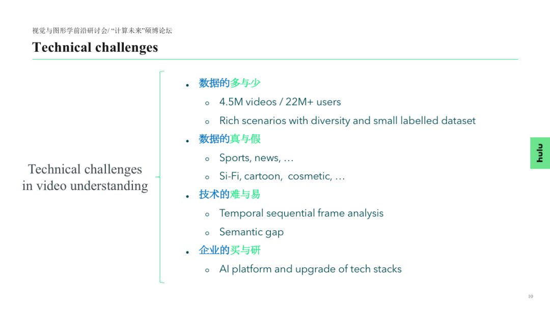 视频内容理解是极具挑战性的研究方向,伴随着深度学习技术的快速发展,该领域也受到了越来越多高校、研究机构和公司的关注。作为一家在线视频服务公司,Hulu 较早地启动了该领域的研究工作,在本次报告中,我们将介绍 Hulu 在该领域的相关研发工作,并分享 Hulu 取得的一些阶段性成果。