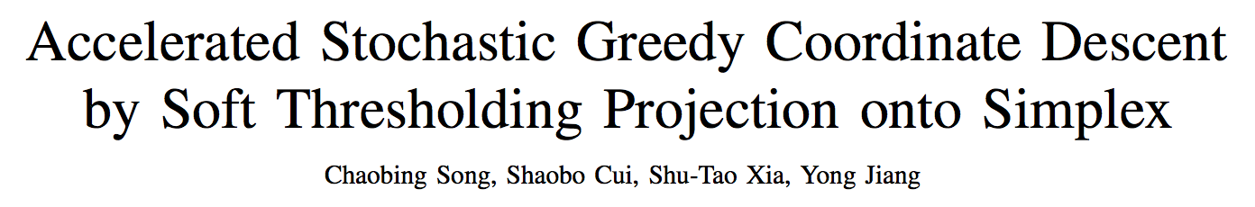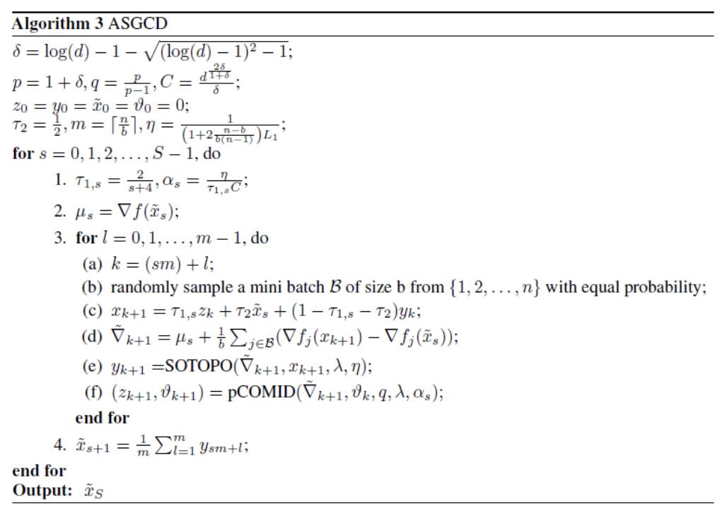 然后基于该新规则和软门限投影算法,通过和一个被精心选择的镜面下降 (mirror descent) 算法做线性耦合,我们加速 GCD 使之达到最优收敛率。与此同时,我们的第二个贡献是我们发现没有必要事先计算完整梯度:采样一个训练样本并计算噪声梯度而不是完整梯度,将足以实现贪心选择。该随机优化方法可以样本大小的倍数减少贪心选择的复杂度。最终的结果是一个加速随机贪心坐标下降算法 (Accelerated Stochastic Greedy Coordinate Descent,ASGCD)。ASGCD 描述如下: