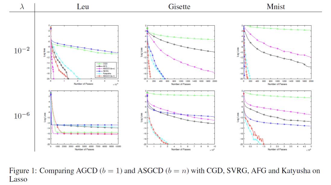 关于该算法的参数设置等说明请见原文。ASGCD 算法具有理论上的最优收敛率,而且对样本稠密且解稀疏的问题,ASGCD 相对于当前最好的算法,如 Katyusha,具有更好的收敛速度。实验如下所示,也验证了这一点。