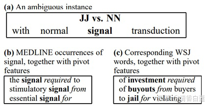 Structural Correspondence Learning(SCL)是比较 General 的方法,它可以应用在目标领域没有带标签数据的场景。这种方法比较 tricky,需要手动的构建 Pivot Feature。所谓 Pivot Feature 就是频繁地在多个跨领域出现并且行为表现也相似的特征。以下面这句摘自 MEDLINE 语料中的句子为例 The oncogenic mutated forms of the ras proteins are constitutively active and interfere with normal signal transduction. 这句话里面的 “signal” 在此处是名词,但如果词性标注模型是用 WSJ 语料训练的,会将其错误的识别为形容词。对比 MEDLINE 语料中 signal 这个词的上下文与 WSJ 语料中名词的上下文,可以发现一些共同的 Pattern,比如都出现在 required、from 与 for 这些词前面,因此可以用这些共同的 Pattern 作为 Feature,训练的模型就可以获得很好的跨领域泛化能力。这些 Pattern 就是 Pivot Feature。