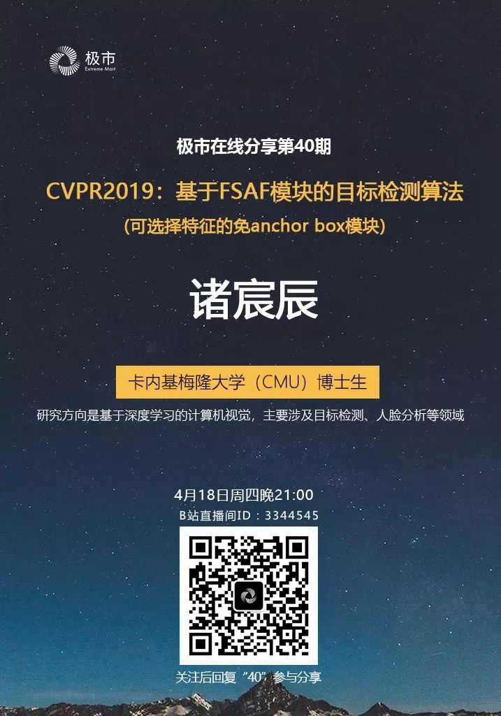 本次分享,极市邀请了CMU(卡内基梅隆大学)的博士生诸宸辰,为我们分享其CVPR2019的工作:基于Anchor-free特征选择模块的单阶目标检测,欢迎各位小伙伴参与直播,与嘉宾互动交流~