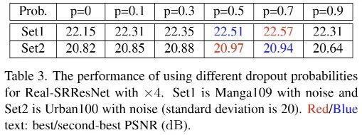在该部分实验中,作者以bicubic退化配置探索Dropout的使用方式。上图给出了关于dropout实用位置、概率以及形式的实验结果对比(注:bicubic退化配置),从中可以看到: