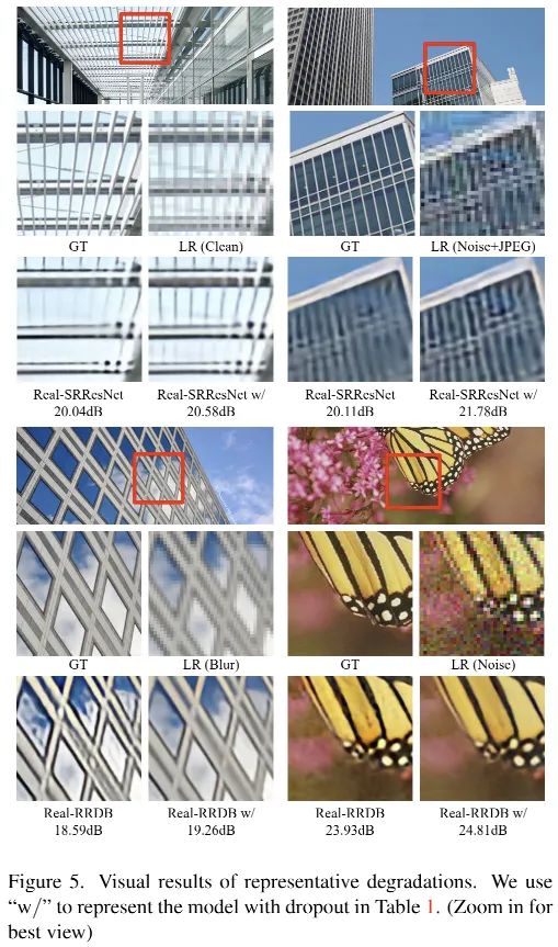 上图给出了使用dropout前后模型的可视化效果对比,可以看到:使用dropout的模型具有更好的内容重建、伪影移除以及降噪效果。总而言之,dropout可以改善多退化配置超分模型性能。
