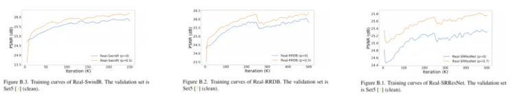 为验证:dropout会不会改变模型的收敛特性。作者以Real-SRResNet、Real-RRDB以及SwinIR进行了对比,见上图。可以看到:dropout不会改变模型的收敛特性,收敛曲线几乎一致,同时具有更优的性能。最后贴上所得dropout使用方案对SwinIR性能影响,见下图。可以看到:采用Dropout训练后,SwinIR的性能得到了进一步提升,最高提升达0.46dB。这进一步说明了所得方案的通用性。