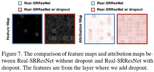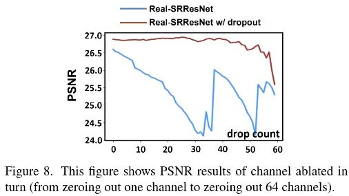 为进一步验证,我们zero某些通道并线性缩放其他特征,结果见上图。可以看到:未使用dropout训练的Real-SRResNet模型性能出现了严重下降;而使用了dropout训练的模型则保持不变。也就是说,对于使用dropout的模型来首,PSNR不再仅仅依赖于特定的几个通道。哪怕丢弃到三分之特征仍可保持性能不变。总而言之,某些特征对于重建更为重要,而****dropout可以平衡不同特征的重要性。