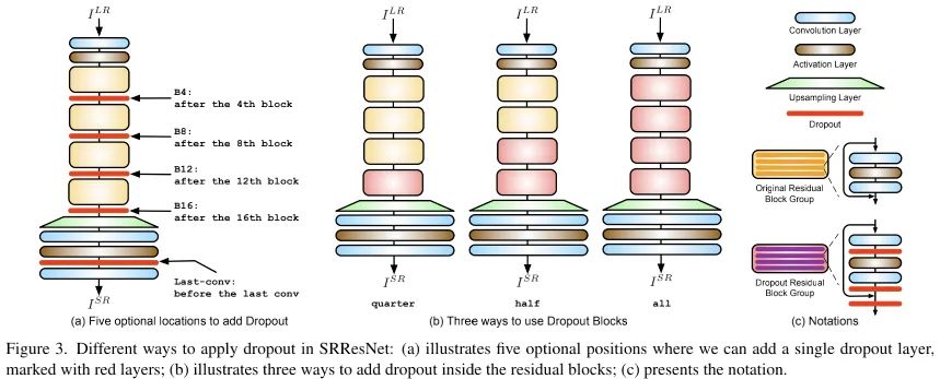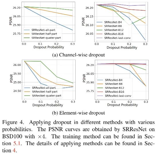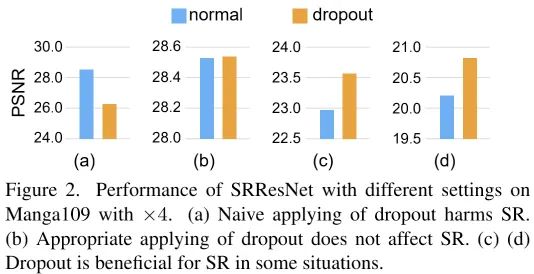 Dropout有助于缓解high-level视觉任务中的过拟合问题,但在low-level视觉任务(如图像超分)中却鲜少应用。作为经典的回归问题,SR具有与high-level任务不同的行为:对dropout操作非常敏感。
